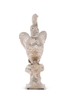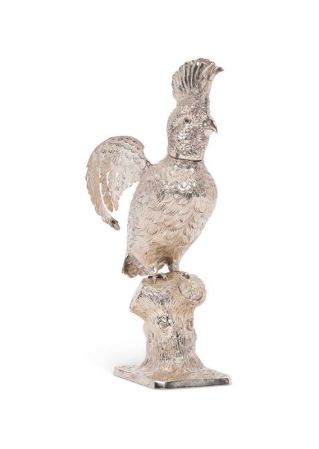SILVER: A LATE 19TH CENTURY GERMAN CORPORATION CUP MODELLED AS A COCKATOOthe parrot with jewelled eyes and removable head, with hinged wings and resting on a branch, on a naturalistic canted rectangular base, marked 800, 454 grams in weight,27cm high