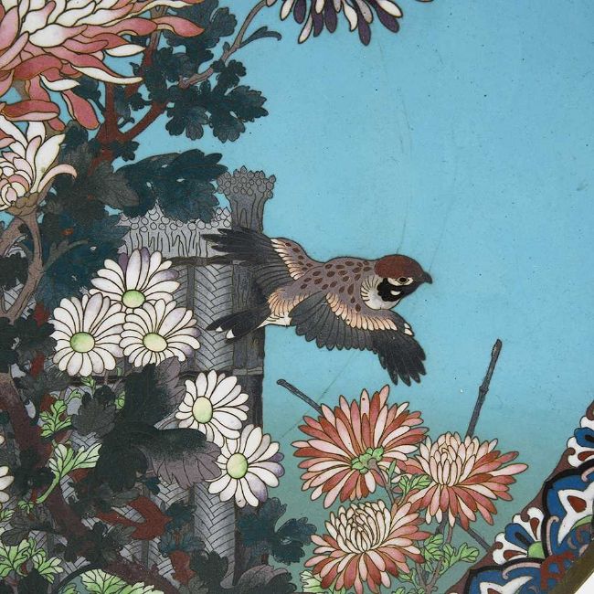A LARGE PAIR OF LATE 19TH CENTURY JAPANESE MEIJI PERIOD CLOISONNE CHARGERSthe plates or dishes of circular form and decorated with birds amongst blossom on a turquoise ground,within a polychrome enamel geometric borders, the undersides with a fan shaped reticulated design,45cm diameter (2)