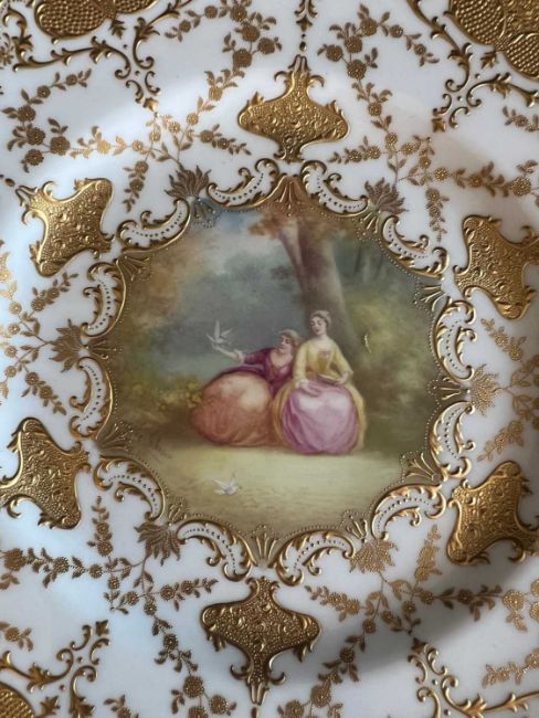 EX V&A COLLECTION: A FINE ROYAL DOULTON PORCELAIN CABINET PLATE BY LESLIE JOHNSON AND SIX FURTHERthe larger central plate centred by a Watteau inspired scene of two ladies and a musician in 18th century dress, signed 'L. Johnson', within a gilt trellis and strapwork pattern border on a cobalt blue ground, the reverse marked 'ROYAL DOULTON ENGLAND', and with paper label inscribed 'V.&A. Museum Department of Ceramics, No. 335', also with circular paper label for DOULTON BURSLEM & CO LTD. marked S.P. 1386, together with a set of six plates also painted by Leslie Johnson with similar scenes, and gilt raised decoration on a white ground, the backs marked ROYAL DOULTON ENGLAND and R.a. 5873, with other numberrs in 3000's, all mounted in a leather covered display / travelling case,the central plate 27cm diameter, the set of six 23cm diameter. the case 79cm x 84cm (7)
