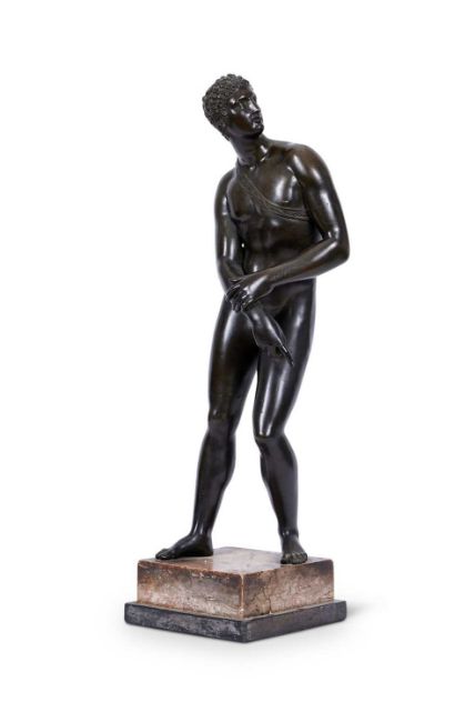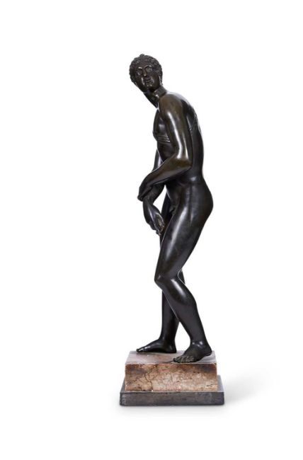 A 19TH CENTURY CLASSICAL STYLE BRONZE FIGURE OF AN ATHLETEthe standing male nude looking to sinistre, dark brown patination, raised on a stepped, square marble plinth,61cm high