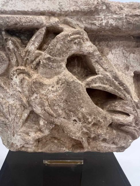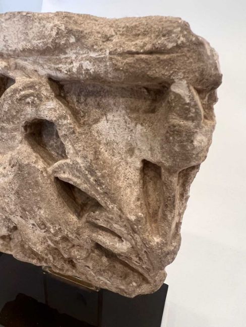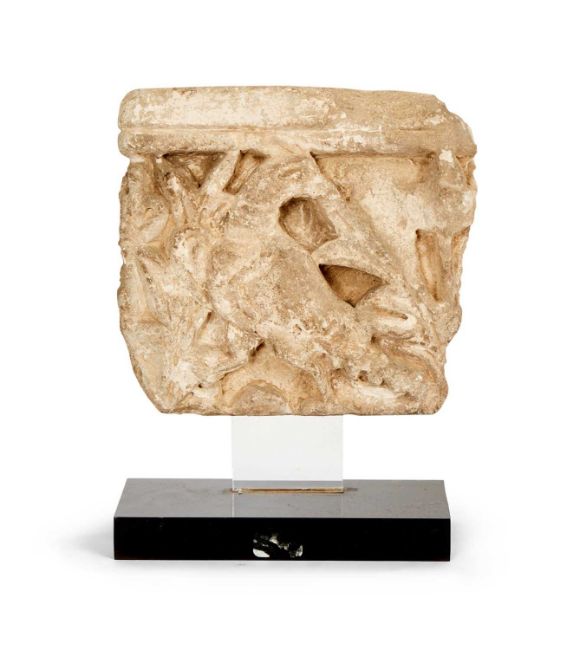 ITALO-ISLAMIC: A CARVED STONE RELIEF FRAGMENT, PROBABLY SICULO ARABIC 12TH CENTURYthe architectural fragment carved in relief with a bird (probably a goose or duck) amongst foliage, with flat back, later mounted on a perspex stand,15cm high x 16cm wide, 21cm high including stand