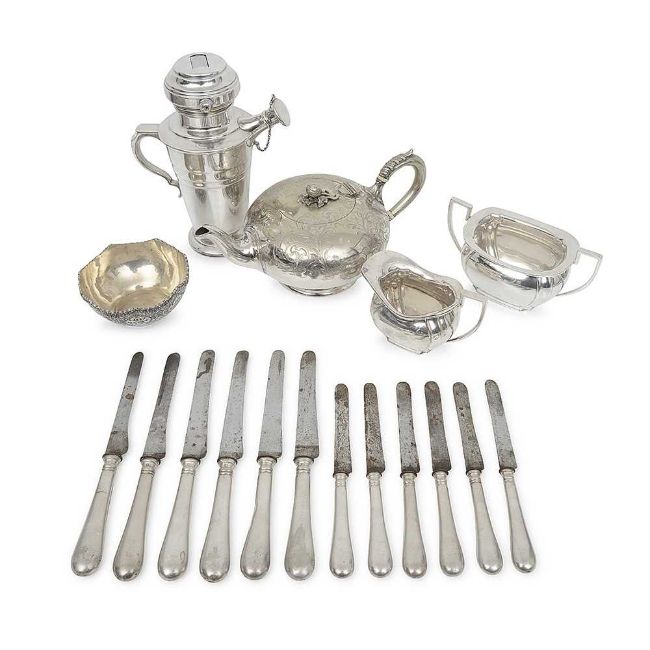 A COLLECTION OF SILVER AND SILVER PLATED ITEMScomprising a silver oval shaped two handled sugar bowl, J.R. Sheffield, 1938 (295g) with ensuite cream jug (195g), together with a Middle Eastern white metal bowl with engraved decoration, a silver plated 'Mixit' cocktail shaker, the ocover with engraved rotating cocktail menu (24cm high), a Victorian silver plated teapot with foliate engraved decoration, 12cm high, and a set of six Christofle, late 19th century silver plated handled and steel dinner kinves and six ensuite dessert knives, (12)17 in total