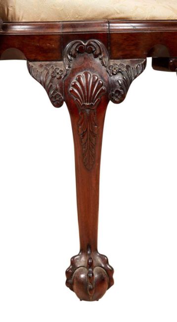 A 19TH CENTURY IRISH MAHOGANY OPEN ARMCHAIRthe desk chair in the Georgian style, with a solid carved splat and top rail, outswept arms, oval seat, with scallop scroll seat rail, on carved cabriole legs with shells, on claw and ball feet, with restorations,the widest point 71cm