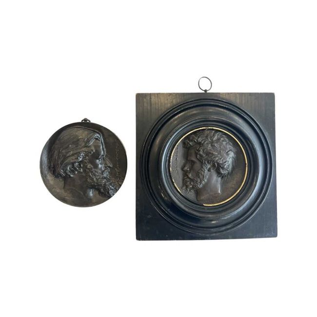 DAVID D'ANGERS AND OTHERS: A LARGE COLLECTION OF 19TH AND 20TH CENTURY PORTRAIT PLAQUEScomprising -THREE 19TH CENTURY FRENCH BRONZE PORTRAIT MEDALLIONS: ALPHÉE DUBOIS (FRENCH, 1831-1905) A MEDALLIC PORTRAIT OF SIR HERMANN DAVID WEBER (1823–1918) P. GIRARDIN (FRENCH, Mid 19th Century), IN THE STYLE OF PIERRE-JEAN DAVID, CALLED DAVID D'ANGERSP. GIRARDIN (FRENCH, Mid 19th Century), IN THE STYLE OF PIERRE-JEAN DAVID, CALLED DAVID D'ANGERS PORTRAIT OF FRANCOIS-VINCENT RASPAIL (1794-1878), REPUBLICAN POLITICIAN AND CHEMIST, 1849, cast bronze medallic plaquette, signed and dated below bust P. Girardin, his head to right with long hair, 146mm. JEAN JULES SALMSON (FRENCH, 1823-1902), A LARGE BRONZE MEDALLIC PORTRAIT PLAQUE OF L. C. RAGONOT Professor and “French Teacher, Birmingham”, c. 1860’s, in the style of David d’Angers, bewhiskered bust left with tied cravat, name before face, signed below truncation, ‘JULES SALMSON. F., 180mm -TWO BRONZE PORTRAIT PLAQUES CHARLES JEAN MARIE DE GEORGE (FRENCH, 1837-1888) : A CIRCULAR BRONZE RELIEF PORTRAIT PLAQUETTE OF JEAN-LOUIS PASCAL (1837-1920), architect, his bearded face to right, inscribed 'L. PASCAL ARCH', signed 'Degeorge' below truncation, the edge marked 'F. BARBEDIENNE. FONDEUR.', 138.5mm. (5½ ins) Ex. Collection Ralph Holland (1917-2012), Art Historian. A CIRCULAR BRONZE RELIEF PORTRAIT PLAQUETTE OF HENRI REGNAULT (1843-1871), painter, his bearded face to left, inscribed 'H. REGNAULT', signed below truncation 'De George - Rome' below truncation, 130mm (5 1/8 ins); in its original square ebonized wood with raised centre containing the plaque. (2)- TWO MID 19TH CENTURY BRONZE PORTRAIT PLAQUES OF YOUNG MEN comprising: A. LUIGNON (BELGIAN)A. LUIGNON (BELGIAN) A LARGE PORTRAIT PLAQUE OF A YOUNG MAN, “LE JEUNE BOVERIE”, 1844, signed, A. Luignon 1844, his bust right with foppish hair, wearing jacket and loose cravat, his name behind head, “Le Jeune Boverie” and before, “Conservatoire Royale de Musique”, 205mm., in high relief and somewhat in the style of David D’Angers, some verdigris stains PIERRE ANTOINE HIPPOLYTE BONNARDEL (FRENCH, 1824-1856): A CAST BRONZE PORTRAIT MEDALLION OF AN UNKNOWN MAN OF MEDICINE, dated 1850, his bearded head to left, a monogram before him and caduceus behind, signed in 2 lines below “H. BONNARDEL LONDRES. MDCCCL”; the plain reverse with the raised Paris foundry mark of “Eck & Durand”, 178mm. -DAVID D'ANGERS (FRENCH 1788-1856): THREE PORTRAIT RELIEFS TOGETHER WITH ANOTHER PIERRE-JEAN DAVID, CALLED DAVID D'ANGERS (FRENCH 1788-1856): PORTRAIT OF PIERRE-JEAN DE BÉRANGER (1780-1857), poet and songwriter, seemingly a mid-19th century cast made by the electrotype process with lead covered reverse, his bust in high relief left, signed below truncation 'DAVID' and dated 1830, 67mm, mounted in a square mahogany frame, 126mm. AFTER PIERRE-JEAN DAVID, CALLED DAVID D'ANGERS (FRENCH 1788-1856): PORTRAIT OF LOUIS ANTOINE LEON DE SAINT-JUST (1767-1794), cast metal medallic tribute plaquette to St Just, French Revolutionary, military and political leader, “L' Archange de la Terreur”, member and president of the National Convention, the youngest of the deputies elected, his head to left wearing high collar and cravat, his name behind, signed ‘David’ below truncation, 168mm., foundry signature of Eck & Durand, smooth grey patination; Notes: There is a specimen in the Louvre (RF 2662), which is signed and dated, ‘David 1838’. It also has the foundry signature of Eck & Durand. David also executed a marble bust of Saint-Just. Jean-Georges Eck (1795- 1863) & Pierre Durand (1794–1880). 3. PIERRE-JEAN DAVID, CALLED DAVID D'ANGERS (FRENCH 1788-1856): PORTRAIT OF FRANCOISVINCENT RASPAIL (1794-1878), REPUBLICAN POLITICIAN AND CHEMIST, 1835, cast bronze medallic plaquette, signed and dated below ‘David 1835’, his head to right in high relief, facsimile signature behind, 146mm. Provenance; Ex. Collection Ralph Holland (1917-2012), Art Historian; bought Simmons Gallery, 4 June 1994 4. sitter: MAXIMILIEN FRANÇOIS MARIE ISIDORE DE ROBESPIERRE (1758–1794), lawyer and statesman, member of the Estates-General, Constituent Assembly, Deputy of the National Convention, the Paris Commune and Revolutionary Tribunal, cast bronze tribute plaquette [1835], his head to left wearing high collar and cravat, 134.5mm., a later aftercast lacking signature and name. -AFTER DAVID D'ANGERS (FRENCH 1788-1856): PORTRAIT OF VICOMTE DE CHATEAUBRIAND (1768- 1848) French romantic writer, politician, diplomat and historian, cast bronze medallic plaquette, probably a later aftercast, signed and dated ‘DAVID 1830’, bust in high relief right, CHATEAUBRIAND behind head, foundry signature, possibly of ‘Thiébaut Frères. 127.5mm - DAVID D'ANGERS (FRENCH 1788-1856): A BRONZE PORTRAIT OF PORTRAIT OF FRANÇOIS-MARIUS GRANET (1777-1849)1827, small bust to right wearing soft cap, signed ‘DAVID’ on truncation and dated below, ‘GRANET PICTOR’ before bust, on thin flan (flan has small piercing to top and bottom), in fitted brass surround, 140mm.,
