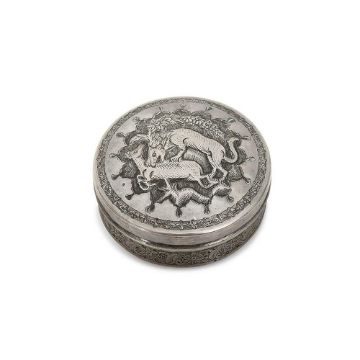 A PERSIAN SILVER SNUFF BOXof circular form, the top depicting a lion devouring an antelope, marked to the underside, with scrolling flowerheads to the sides 63.6 g in weight,6cm diameter