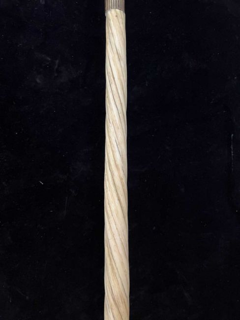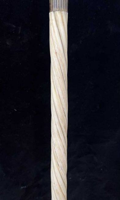 A NARWHAL TUSK (MONODON MONOCEROS), EARLY 20TH CENTURY, MOUNTED AS A FLOORSTANDING LAMP CIRCA 1900the shaft of the standard lamp formed from a large section of narwhal tusk, 130cm in length, mounted on a wooden circular stand, the stand inlaid with circular sections of narwhal tusk and raised on feet carved from whale bone, with a brass light fitting above,208cm high overall, the tusk 130cm high,This lot is sold with CITES Article 10 License No. 628049/01