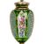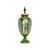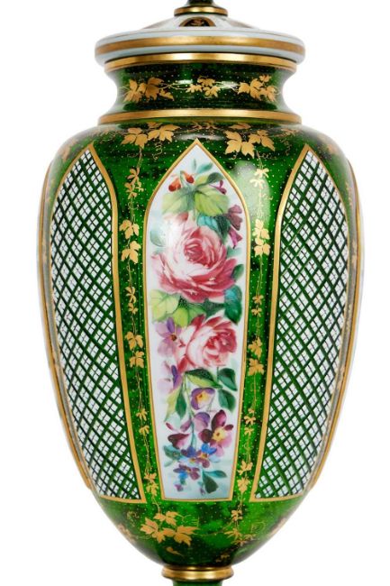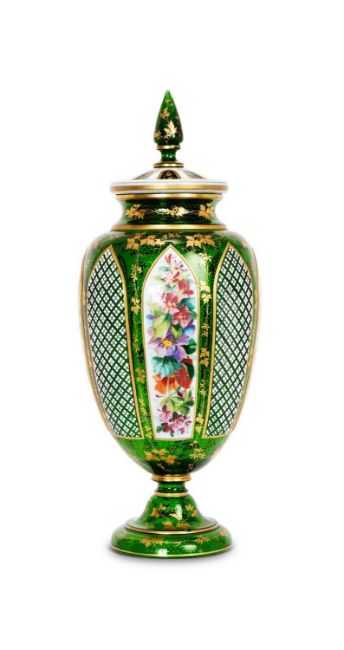 A FINE 19TH CENTURY BOHEMIAN CUT, FLASHED AND OVERLAY GLASS VASE AND COVERthe flashed green lidded urn with domed lid with finial handle, with white overlay glass decoration to the cover centred by recessed lappets decorated with gilt foliage, the baluster body with waisted neck and with arched panels painted with floral bouquets interspersed with panels of strawberry cut diamonds on a gilt ground of scrolling vines, raised on a domed foot,37cm high