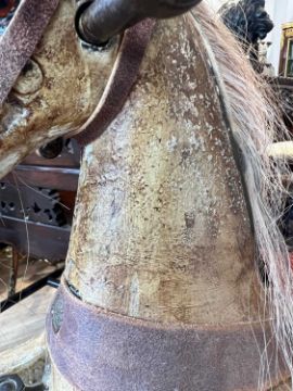 A LATE 19TH CENTURY FRENCH PAINTED WOOD HORSE CHAIN DRIVEN TRICYCLE OR VELOCIPEDEpossibly by August Reidmeister Company, the carved wood body painted palomino, with glass eyes and real horse hair mane and tail, with later leather saddle and bridle, on a pierced cast iron support with chain driven mechanism, on three spoke wheels, 84cm wide x 74cm high
