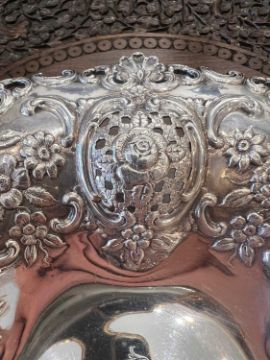 TIFFANY & CO: A STERLING SILVER, LATE 19TH CENTURY TAZZA OR FRUIT STANDthe stand or dish in the Rococo taste with openwork decoration formed from pairs of c scrolls centred by trellis-work, the centre with an engraved strapwork design, the rim formed from various pierced C scrolls and shelles, raised on a cylindrical, spreading stem over a shaped base and four scolling foliate feet, the underside marked 'TIFFANY & CO. 112 30 STERLING SILVER 925 - 1000', 585 grams,23cm wide x 12cm high