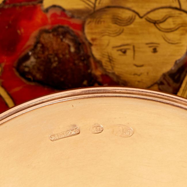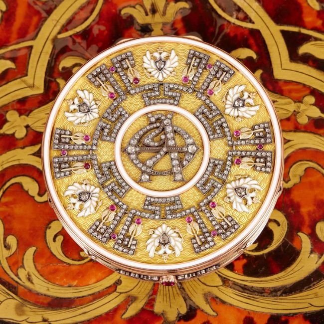 A 14 CARAT GOLD, DIAMOND AND ENAMEL BOX IN THE STYLE OF FABERGEthe 14K Russian style snuff box mounted with precious stones and diamonds, the top with geometric forms encrusted with giamonds and with gold leaves hung with gems, interspersed with enamelled double headed eagle mounts, on a ground enamelled in translucent yellow guilloche enamel, bearing faux Faberge marks, 245 grams overall, in a wooden and velvet lined display box, 8cm in diameter