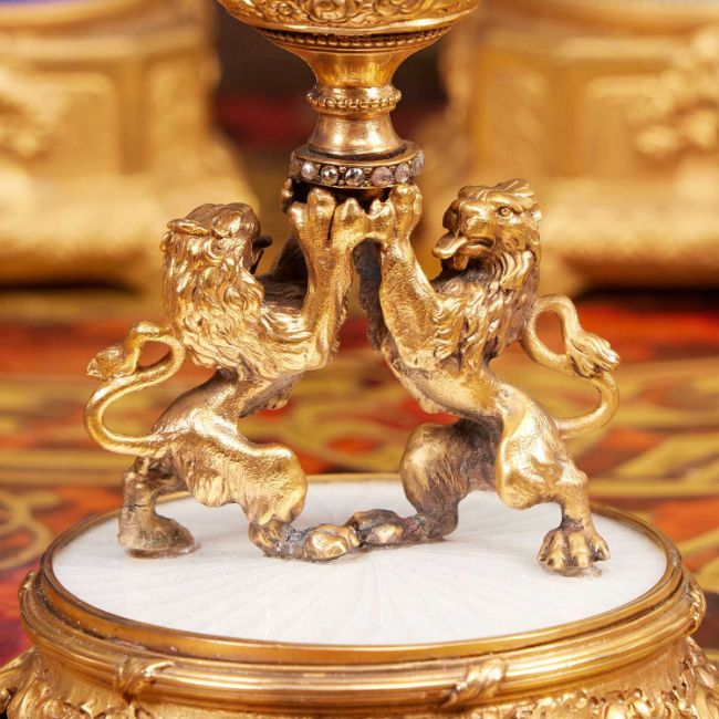 A FABERGE STYLE DIAMOND ENCRUSTED, GUILLOCHE ENAMEL AND SILVER GILT SURPRISE EGGthe Russian Imperial style 'Easter Egg' with ovoid silver gilt mounted body overall enamelled in translucent green enamel, the hinged cover surmounted by a diamond encrusted pinecone finial over a pierced, scrolling mount set with further diamonds interspersed by a diamond set date of 1913, the lower section with diamond set twin headed eagle mounts, raised on a base cast with a pair of lions rampant, over a circular base with Rococo style mounts, the interior decorated with bird, with psuedo Faberge marks, in a wooden display case,the egg 17cm high