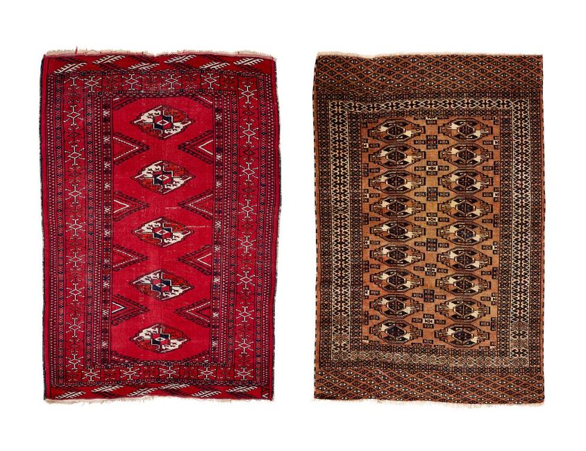 TWO TURKOMAN RUGSAfghanistan, both 1930's, with elephant foot motif to both,the red rug 154cm x 111cm, the other 154cm x 103cmCondition: the red example, in good decorative condition, the loom width to one end unequal. The foundations to the central pile visible in a few places. Selvedges with some wear and ends with traces of fringes. The brown example in good decorative condition, pile and selvedges good. Ends with some fringes.