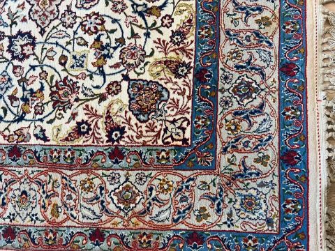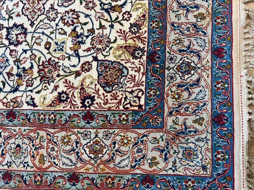 A FINE PART SILK ISFAHAN CARPET, NORTH WEST PERSIAthe Persian rug with central medallion on a cream ground, in blue, red and sage green, with fringe to ends,161cm x 108cm