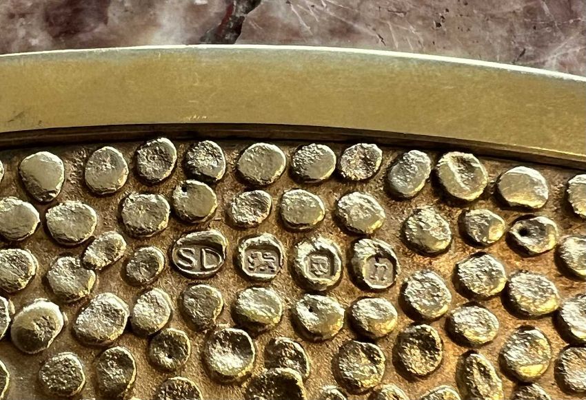 STUART DEVLIN: A PAIR OF STERLING SILVER AND PARCEL GILT MODERNIST PLATES, 1968the circular plates or drinks trays with silver gilt, pebbled rims, and lightly spot-hammered centres, hallmarked to the textured borders, SD, London, 1968, 1400 grams (49 oz) in weight28.4cm diameter (2)