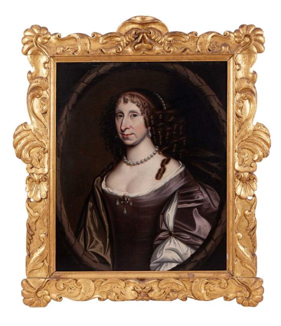 ATTR. TO DAVID SCOUGALL (SCOTTISH, FL. 1654-1682): A 17TH CENTURY PORTRAIT OF DAME HELEN SKENEoil on canvas, Portrait of Dame Helen Skene, daughter of Sir James Skene and wife of Sir Charles Erskine of Alva, the lady wearing a pearl necklace, earrings and headdress, in a purple dressoil on canvas, painted in an oval, in an old giltwood Sutherland frame, inscribed to the back of the frame with the sitter's information, with old Chritie's label,the painting 76cm x 63cm, the frame 97cm x 84cmProvenance; Purchased from by the present owner from Christie's, London, 29th May 2003, lot 14.