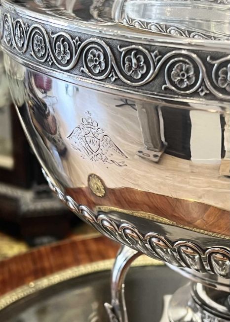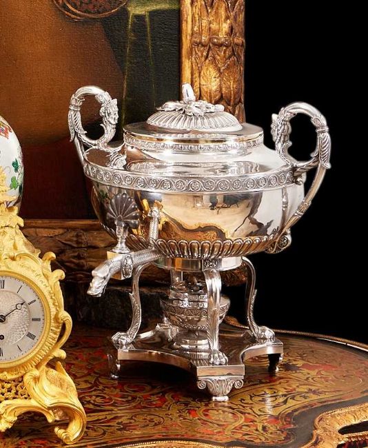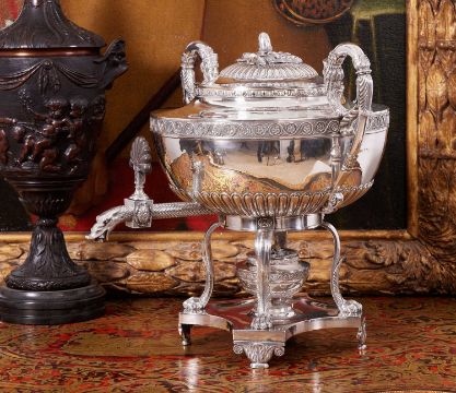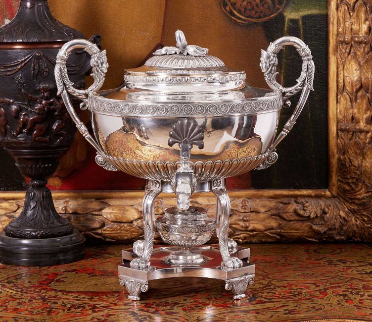 PAUL STORR: A FINE REGENCY STERLING SILVER TEA URN, LONDON, 1816of Neo-Classical style, surmounted by a domed and gadrooned cover with acorn and leaf finial, the finial hallmarked, the domed cover hallmarked, the body with egg and dart border to the rim and silver gilt interior to the urn, with a pair of scrolling, foliate wrapped handles cast with classical female masks, the spout modelled as a serpent with scaled skin, with wooden anthemion shaped handle, with double headed eagle and crown crest to the body, raised on a four legged stand with paw feet over a shaped quadripartite base fitted with an urn shaped burner, the underside hallmarked, Paul Storr, 1816, London, the stand and urn both numbered 106, 5430 grams in weight (191 oz),37cm high x 38cm wide