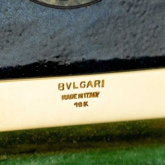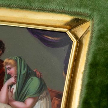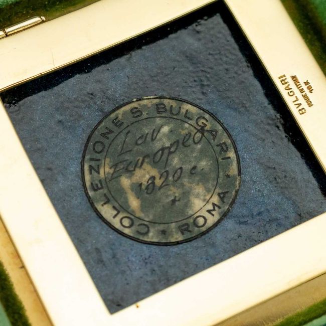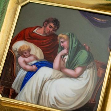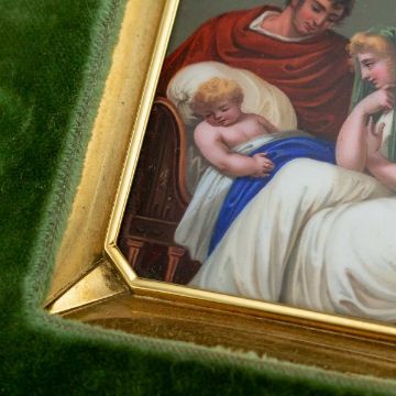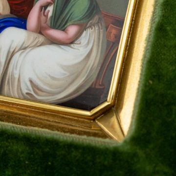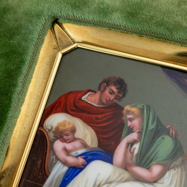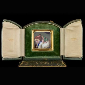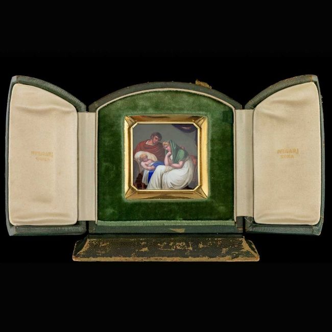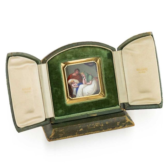 AN 18K GOLD AND ENAMEL EARLY 19TH CENTURY ICON RETAILED BY BULGARIthe 18 carat gold and hand painted enamel plaque / icon, of square shape with cut corners, set in its original green leather bound traveling case, the plaque finely painted depicting baby Jesus with Mary and Joseph by his crib, probably made in Switzerland in the early 1800's and later mounted in gold, hallmarked 18k (750 standard), Made in Italy, Bulgari (Italian luxury brand known for its fine jewellery, watches, fragrances, accessories and leather goods),plaque 6cm, 67.5 grams in weight, case, 12.5cm high x 12cm wide, weight, 230 grams.In excellent condition.