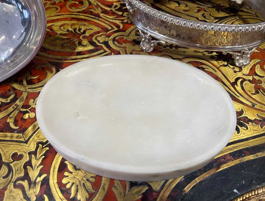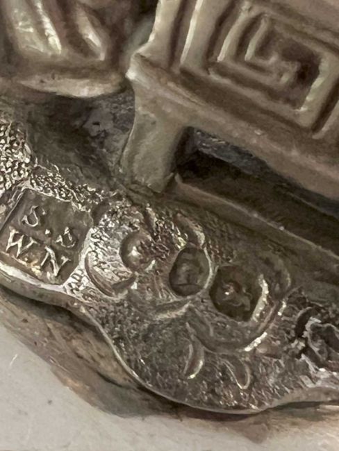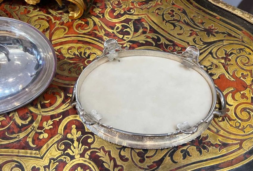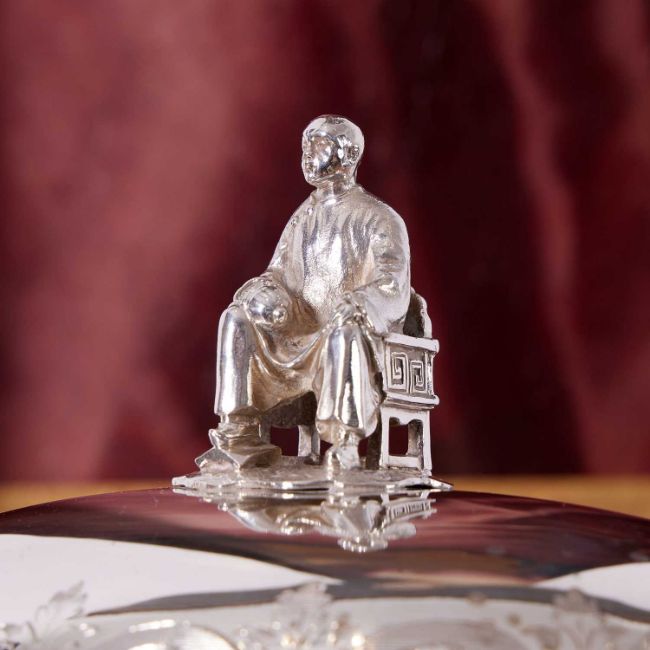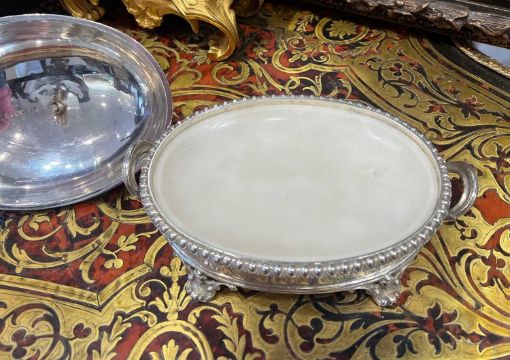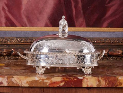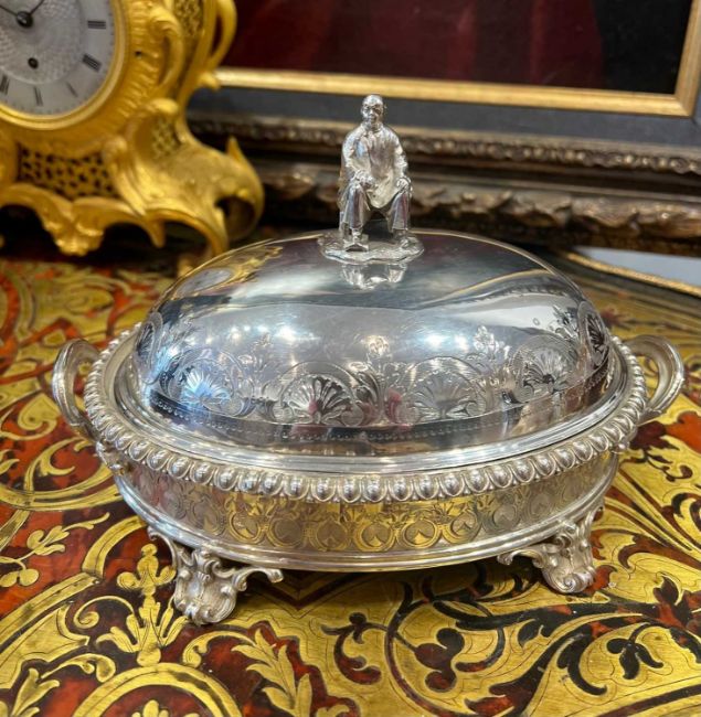 A FINE AND RARE STERLING SILVER BUTTER DISH WITH CHINESE FIGURE, LONDON, 1857of oval form, the domed cover with C scroll and acanthus decoration to the border, surmounted by a handle modelled as a figure of a seated Chinese man, the dish with a pair of scroll handles and raised on four, C scroll, pierced feet, with egg and dart border and carved marble liner, the dish, cover and figure with hallmarks for London, 1857, SSWN for Smith, Nicholson & Co (Stephen Smith & William Nicholson, Duke Street, Lincolns Inn Fields, London), 650 grams (23 oz) in weight excluding marble liner,21cm wide x 13cm high