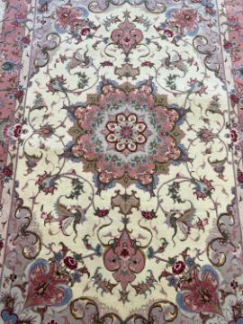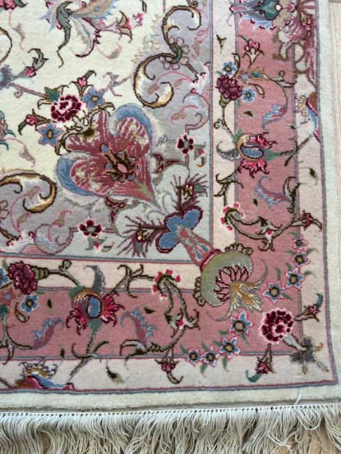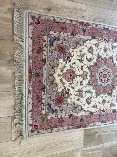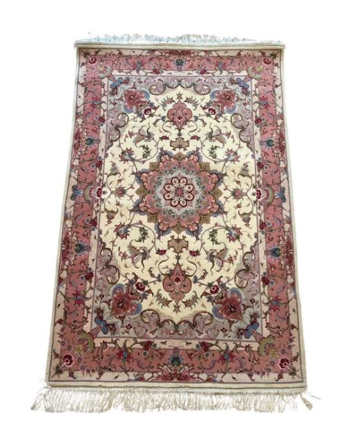 A FINE PART SILK TABRIZ CARPET, NORTH WEST PERSIAthe Persian rug of pink design on a cream ground, with fringe to both ends,153cm x 101cm