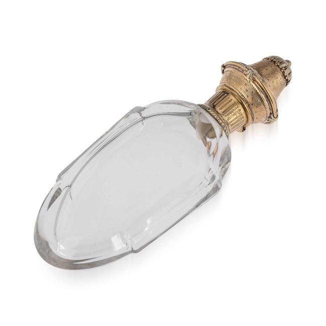 AN 18K GOLD ANTIQUE PERFUME BOTTLE, FRENCH, MID 19TH CENTURYthe scent bottle with lozenge shaped glass body set with a gold collar and hinged lid engraved with engine turning and scrolling foliage, apparently unmarked (tested 750 standard, used 1838 - present), comes in its original leather bound retail box, 69 grams in weight,10cm high x 2.5cmCondition: In good condition.