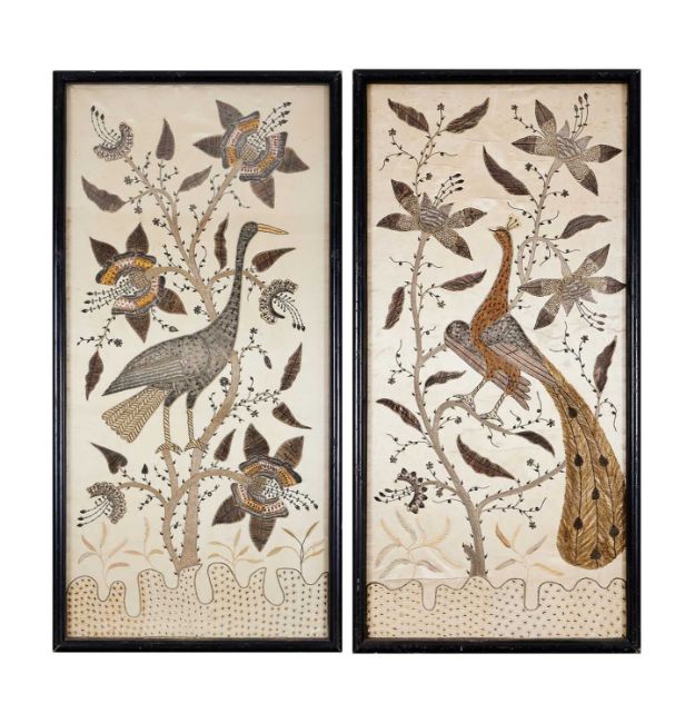 A PAIR OF 19TH / EARLY 20TH CENTURY INDIAN SILK AND METAL THREAD EMBROIDERED PANELS OF STORKSworked in gold and silver coloured metal thread with sequins, mounted in ebonised and glazed frames,115cm x 56cm including frames (2)