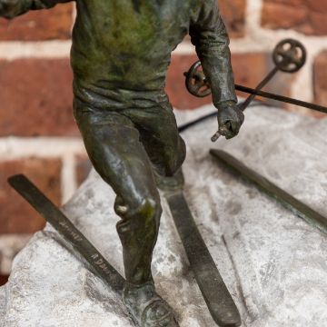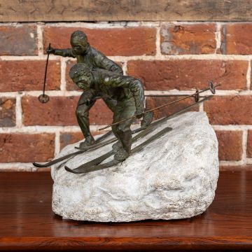 A FRENCH ART DECO BRONZE MODEL OF SKIERS ON WHITE STONE BASE, R DAVID c.1920Antique 20th Century French Art Deco bronze by R. David, dating to the 1920's. The piece features two skiers racing, set on a white stone base that mimics a snowy hillside. This unique decoration adds charm to any home or ski lodge in snowy mountains. The bronze is signed on one ski with "Bronze - R David."In Great Condition - Wear expected with age. Please refer to photographs.Height: 30 cm // 11.81 in Width: 42 cm // 16.54 in Depth: 38 cm // 14.96 in Weight: 18,340 g // 646.98 oz