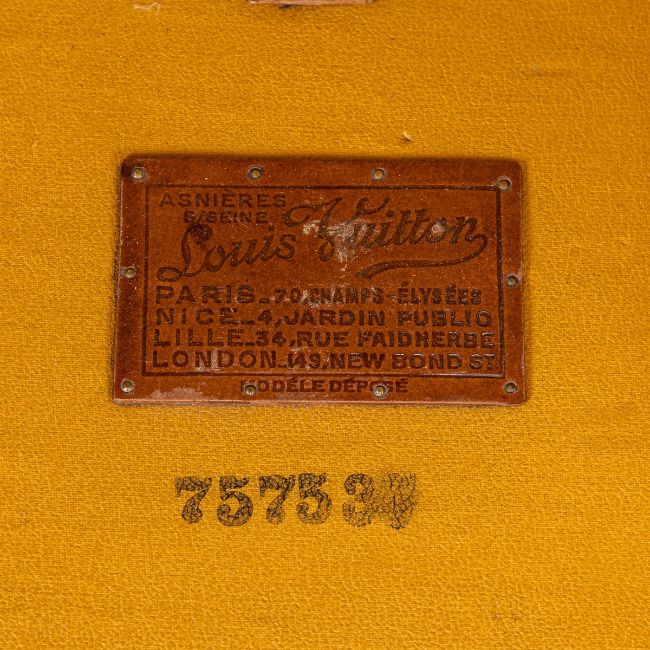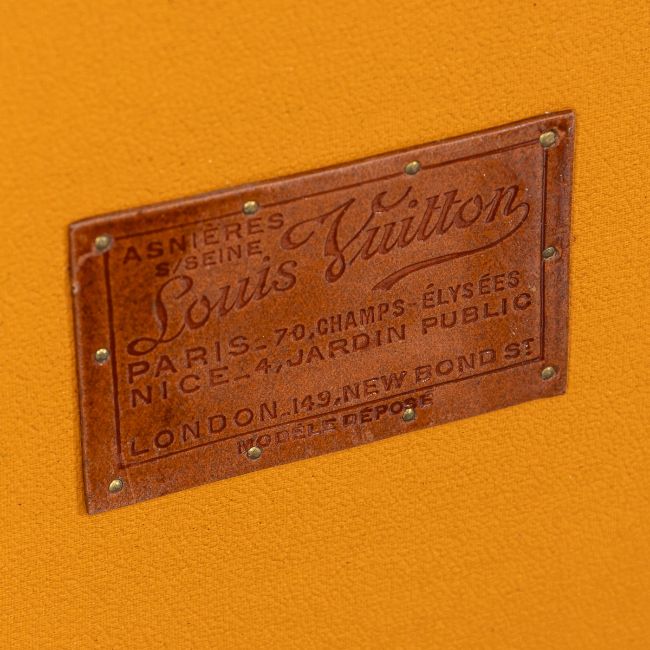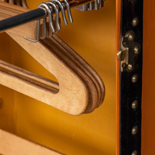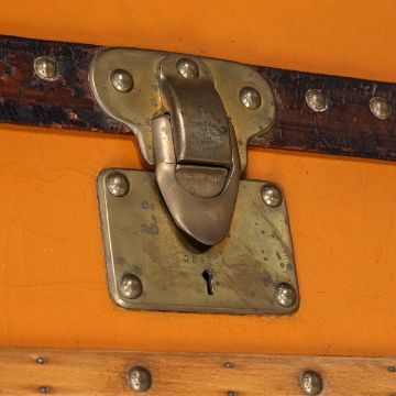 LOUIS VUITTON: AN ANTIQUE WARDROBE TRUNK IN ORANGE "VUITTONITE" CANVAS c.1920early 20th century vintage, circa 1900-1910. Draped in the distinctive orange "Vuittonite" canvas, this vertical trunk opens to reveal spacious hanging compartments on both sides, providing a charming blend of functionality and elegance. The rarity of trunks adorned with this unique finish, known for its stain and water-resistant properties, sets it apart from its more common monogrammed counterparts. Once a staple canvas for Vuitton's trunks from the turn of the century to the 1920s, the orange Vuittonite canvas has become a sought-after treasure for collectors, making this wardrobe trunk a unique and appreciated addition to any discerning collection. An exquisite focal point for interior decor, it not only tells the story of Louis Vuitton's historic craftsmanship but also stands as a testament to the enduring allure of vintage luxury.In Good Condition Keeping With Age. Lacking Key Width: 56cm Height: 114cm Depth: 56cm