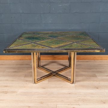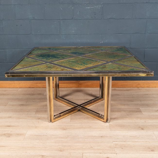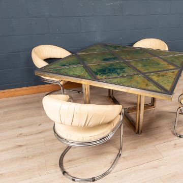 ROMEO REGA FOR METALARTE: AN ITALIAN BRASS AND CHROME PLATED TABLE c.1970dining table or centre table designed by Romeo Rega for Metalarte, made in Italy in the 1970s. The table structure is made entirely out of brass and chrome, the top of which has brass framed glass tiles, the glass having an antiqued green glaze effect which has a translucent effect, changing in colour according to the reflection of light. Romeo Rega made a few of these tables but this particular model with green glass tiles is exceptionally rare. They are more commonly seen with brown glass tiles, mirrored or smoked glass tiles, or even burr walnut inlay. It is hard to overstate how striking this item is, a real eye-catcher that uplifts any modern interior and certain to gain in value and appreciation over time.In Good Condition - Good original vintage condition, The table has been hand polished but still has traces of thick tarnish, particularly to the table legs. There is a tiny fracture to the glass on one of the tiles about one centimetre from the perimeter. Overall very good vintage condition. Please refer to photographs.Width: 140cm Height: 140cm Depth: 72cm