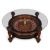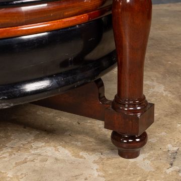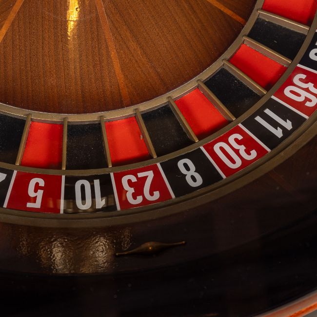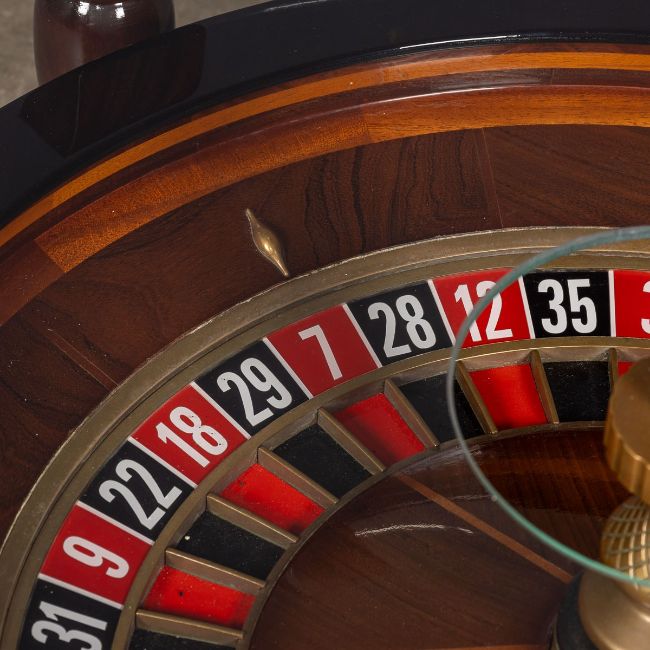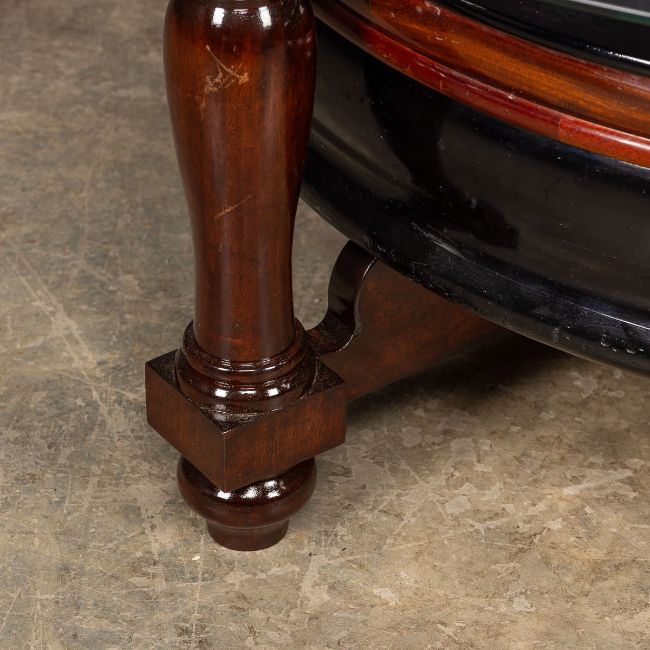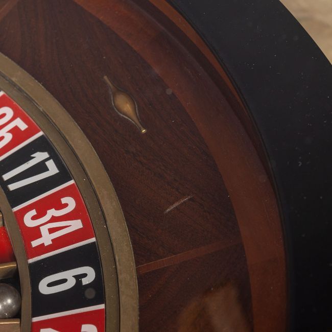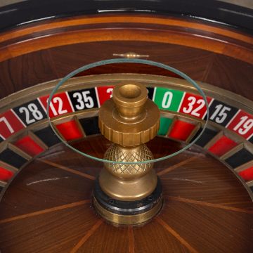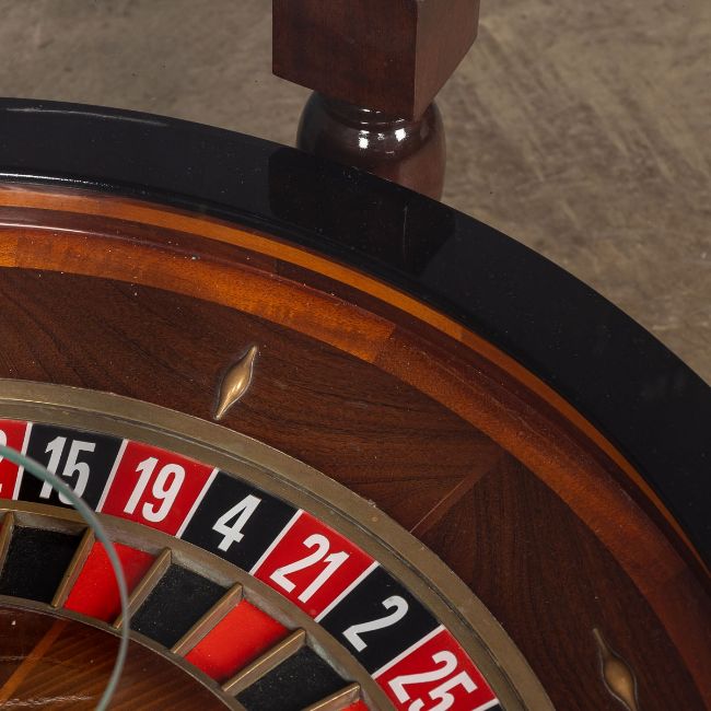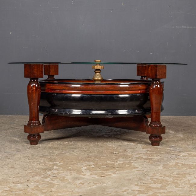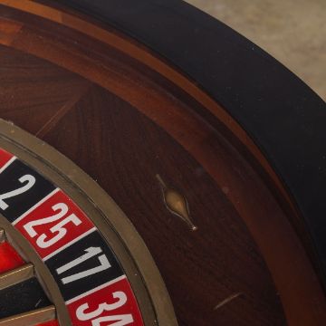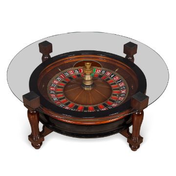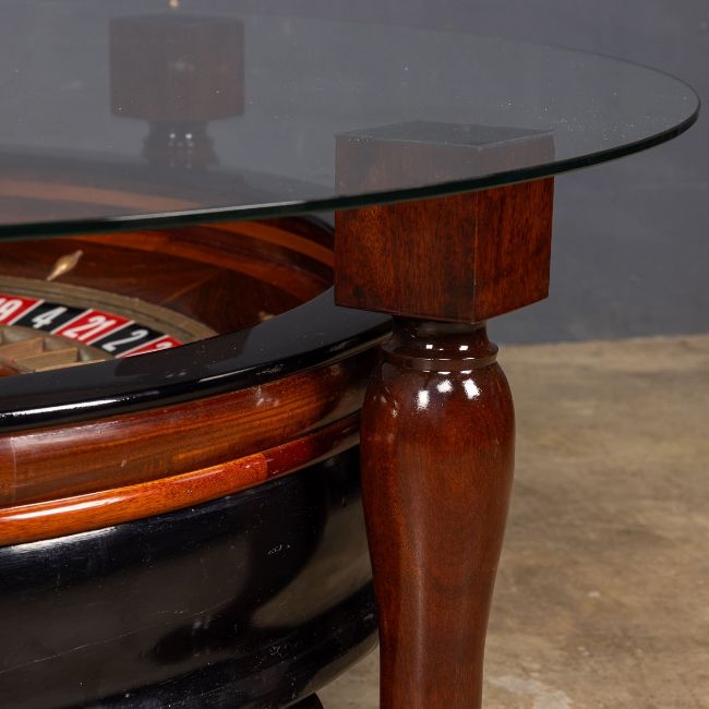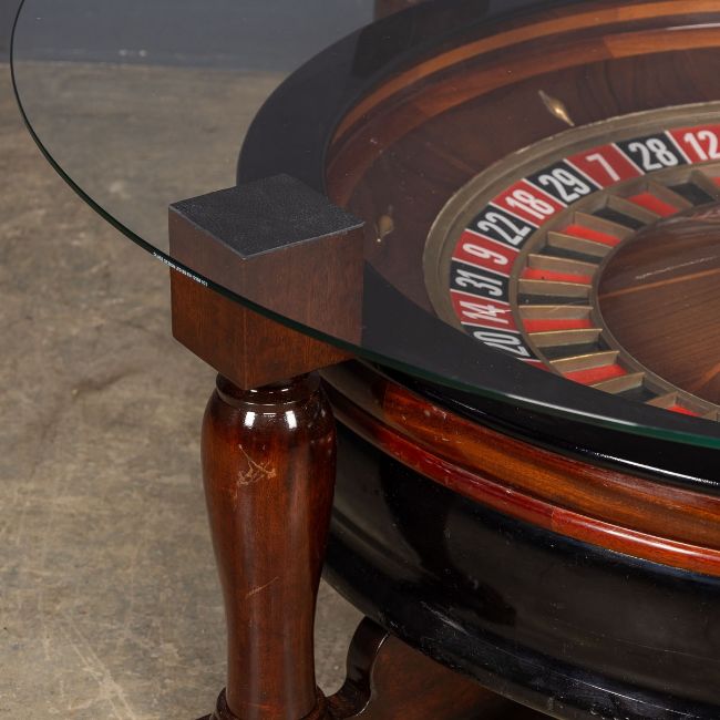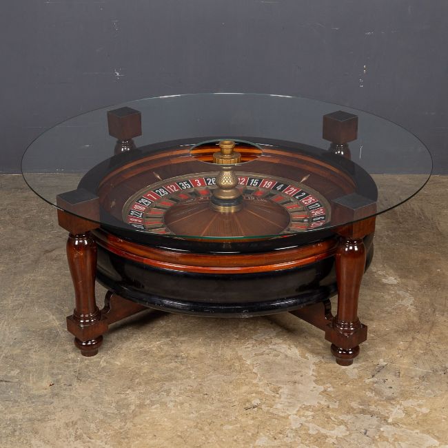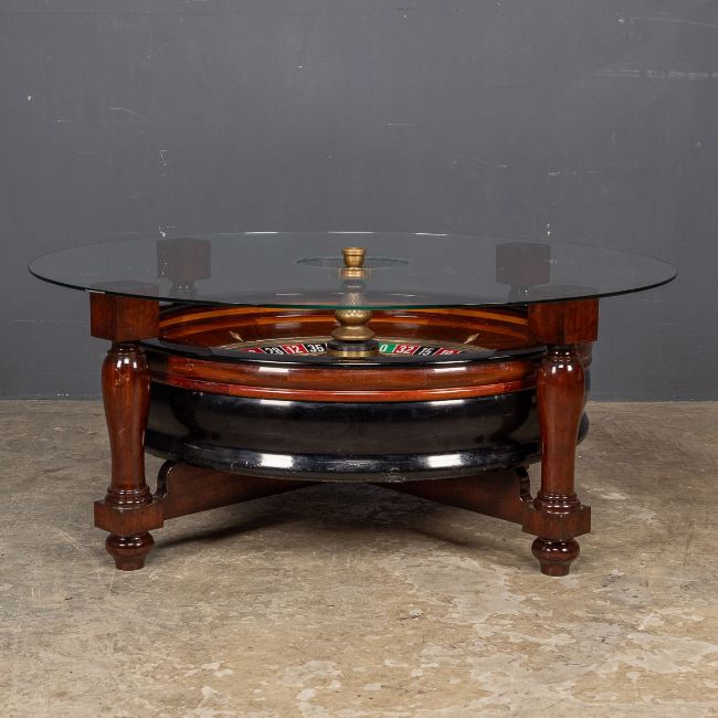 A CASINO ROULETTE WHEEL MOUNTED WITHIN A COFFEE TABLEBehold, an exquisite casino roulette wheel, a masterpiece of craftsmanship, resplendent in mahogany wood adorned with intricate brass detailing. This opulent creation rests upon a finely turned mahogany base, elevating it to a true work of art. What sets this roulette table apart is its clever design, featuring a removable glass tabletop. This transparent marvel grants easy access to the captivating roulette wheel beneath, allowing players to indulge in the excitement of the game without the need to remove the glass. A perfect fusion of style and functionality, it offers both a luxurious aesthetic and a seamless gaming experience, making it a must-have centerpiece for any gaming aficionado's sanctuary.In Great Condition - Glass and stand is modern.Height: 47cm Diameter: 107cm