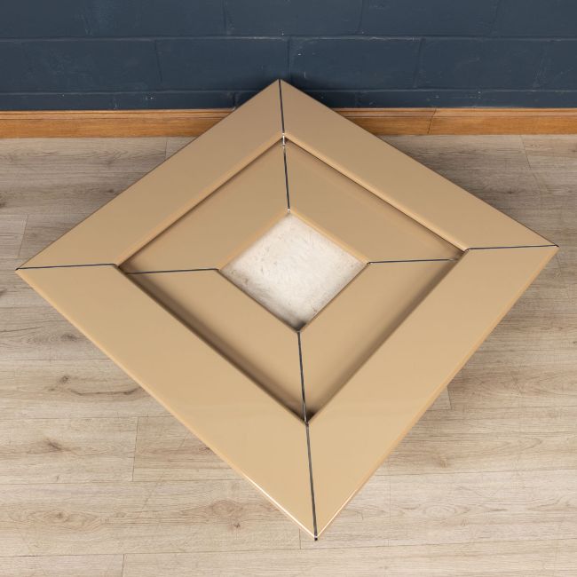 PAOLO PIVA c.1980: A B&B ITALIA COFFEE TABLEA B&B Italia coffee table by designed by Paolo Piva, made in Italy around the 1980s. This elegant coffee table consists of a lacquered wood two-tier top over a travertine base. The design was an instant success and is already a design classic. Available in a multitude of colour combinations, this particular example has a beautiful cream top which, together with its travertine base, gives a sense of light and space to any interior. A contemporary classic.In Great Condition - Only minor chips along the bottom edge of the travertine base. Table top is only placed on top of the travertine base with guides, can be easily fixed to the base using four simple bolts which can be provided if required from the buyer. One support damaged (hairline crack) but present and working. Overall excellent condition, please refer to photographs.Width: 110cm Depth: 110cm Height: 32cm