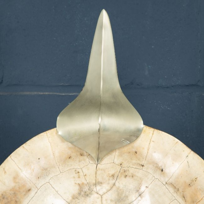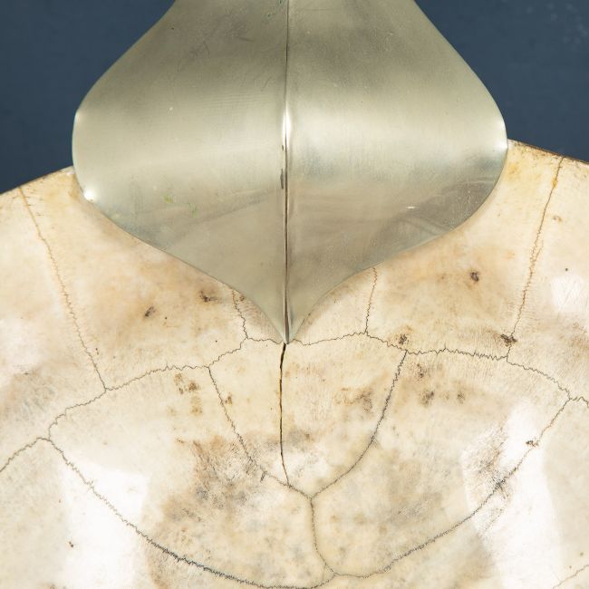 ANTHONY REDMILE: A TURTLE SHELL LAMP, JAMES BOND 007 INTEREST c.1970A late 19th Century “blond” turtle shell later mounted on an silver plated stand as a side lamp by the renowned designer Anthony Redmile. Anthony Redmile burst into the London interior design scene in the 1960s, producing some of the most eclectic items for his illustrious clients. Known to use items which were taken or inspired by the natural world, this item exemplifies Redmile's work. This particular lamp has a very interesting pedigree. Not only was it made by Redmile but it also featured in the 1974 James Bond film: Man With The Golden Gun, based on the novel by Ian Fleming and starring Roger Moore, Christopher Lee, Herve’ Villechaize, amongst many others. The scene featuring this lamp in Scaramanga’s house (the villain of the film) can be seen in the second image. These turtle shells were South American river turtles and would be captured to take on board the merchant ships of the 19th century. The turtles were then boiled (to make turtle soup) and eaten, with one turtle capable of feeding reputedly up to 100 sailors. However, the left overs were not simply thrown overboard. Often a sailor would take the shell and polish it by hand for hours on end giving it a gloss-white finish and sell it as an item of curiosity for a few shillings once docked at home which explains why most of them tend to turn up for sale in the northwest of England in the proximity of Liverpool, one of the busiest trading ports of the world at the time. Today these make for wonderful conversation pieces, appealing to interior designers, collectors of natural history and maritime antiques. Scientific name: Podocnemis Expansa, listed CITES Appendix II, Annex A (exempt). As this specimen is pre-1947 no article 10 is required.In Good Condition - wear consistent with age, heat from the old traditional filament bulbs has caused some cracking to the shell. This should no longer be an issue with the modern LED bulbs. The silver plated mounts have dulled and tarnished.Height: 113cm Width: 53cm Depth: 19cm