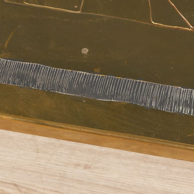 WILLY DARO: AN AGATE AND BRASS CLAD COFFEE TABLE, BELGIUM c.1970A rare and unusual coffee table by Willy Daro, made in Belgium in the 1970s. The coffee table embossed and acid etched on brass with an agate inset and abstract motifs. Signed "Willy Daro" to the top, an extremely sought after piece of post-war art furniture.Willy Daro owned Les Nouveaux Ateliers Willy Daro and worked in Brussels from the late 1960s to 1987. His pieces are fabulous examples of an eccentric, modern and bold style. He is particularly well known today for his lamps and furniture, where he often combined brass and chrome with large natural materials such as agate, semi-precious stones, coral and shells, or botanical and floral sculptural forms. The designs from the 1970s combined the Brutalist style with fossils and minerals. Daro’s designs were sophisticated, with luxurious materials and great attention to detail, making each item a unique sculptural piece of artIn very good, some surface scratches to the brass throughout, small dents but overall good vintage condition. Please refer to photographsHeight: 34cmWidth: 95cmDepth: 95cm