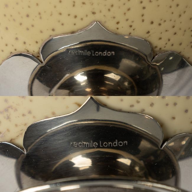 ANTHONY REDMILE: A PAIR OF OSTRICH EGG MOUNTED SILVER PLATE CANDLESTICKS, c.1970A pair of ostrich egg candlesticks with silver plated mounts by Anthony Redmile. Impressed and signed Redmile London, retailed in his shop and purchased in the 1970s.In Good Vintage Condition. Please refer to photographs.Height: 27.5 cm // 10.83 in Width: 12 cm // 4.72 in Depth: 12 cm // 4.72 in
