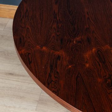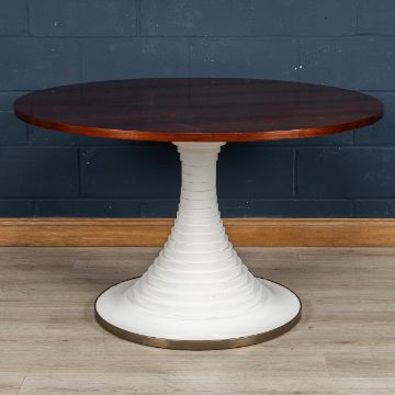 CARLO DE CARLI FOR SORMANI: AN ITALIAN "MODEL 180" TABLE c.1971by the esteemed Carlo De Carli for Sormani, Italy, dating back to 1971, with white lacquer base, a testament to De Carli's penchant for harmonising form and function. The juxtaposition of the pristine lacquer against the rich wood top creates a captivating visual contrast, exemplifying the sophisticated design language characteristic of this iconic collaboration. The table's design, marked by clean lines and a meticulous attention to detail, reflects both the ingenuity of Carlo De Carli and Sormani's commitment to crafting enduring pieces. In very good vintage condition. Some minor crazing to the white lacquer foot. Please refer to photographs.Height: 75cm Diameter Top: 124cm Diameter Base: 74cm