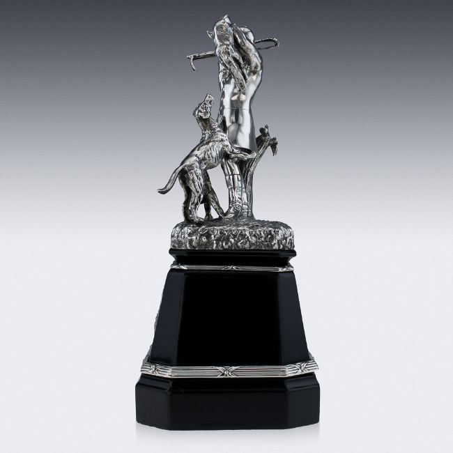 A 19TH CENTURY STERLING SILVER HUNTING TROPHY, ELKINGTON, C. 1894the antique, Victorian solid silver important figural hunting statue, depicting a huntsman holding a fox and his hounds at his feet. Standing tall on an ebonized plinth applied with an engraved plaque 'Presented to W.J Buckley Esquire, April, 18th, 1895', hallmarked English silver (925 standard), Birmingham, year 1894, Maker E&CoLd (Elkington & Co Ltd), In Great Condition - No Damage. Height: 33.5cm Width (base): 20.5 x 14cm Total Weight: 2952g