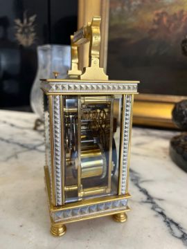A LATE 19TH CENTURY FRENCH GILT AND SILVERED BRASS CARRIAGE CLOCK WITH REPEATthe unusual case with dentil cornice, angles and plinth with silvered highlights, the white enamelled dial with Roman numerals, the twin barrel movement striking on a coiled steel gong, with lever platform escapement, with winder,18cm high handle upIn working order but not fully tested or guaranteed.
