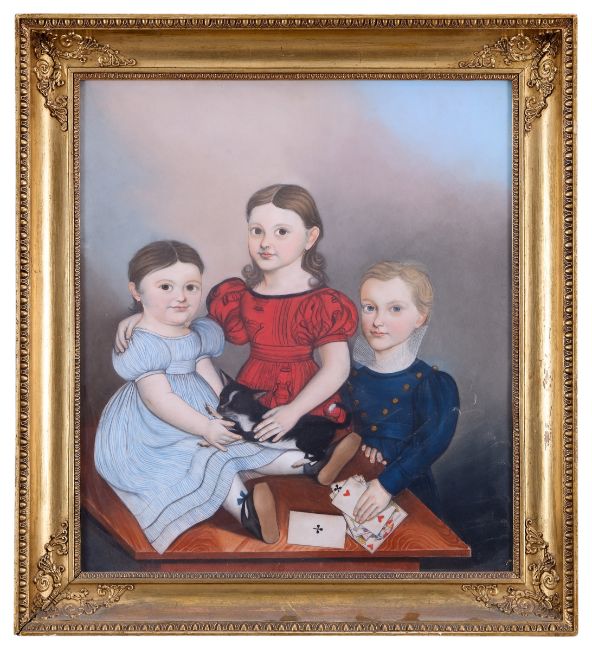 AMERICAN FEDERAL SCHOOL: A MID 19TH CENTURY PAINTING OF CHILDRENoil on canvas, the primitive Folk Art style painting depicting three children and a cat at a card table with playing cards, re-lined, later framed in a gilt frame with perspex,the painting 66cm x 58cm
