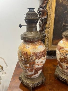 A PAIR OF MEIJI PERIOD JAPANESE SATSUMA POTTERY VASE LAMPSlate 19th / early 20th century, with bronze mounts, raised on circular pierced bases cast with elephant head feet, with oil lamp fittings to the top, 44cm high (2)