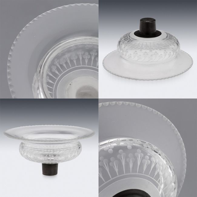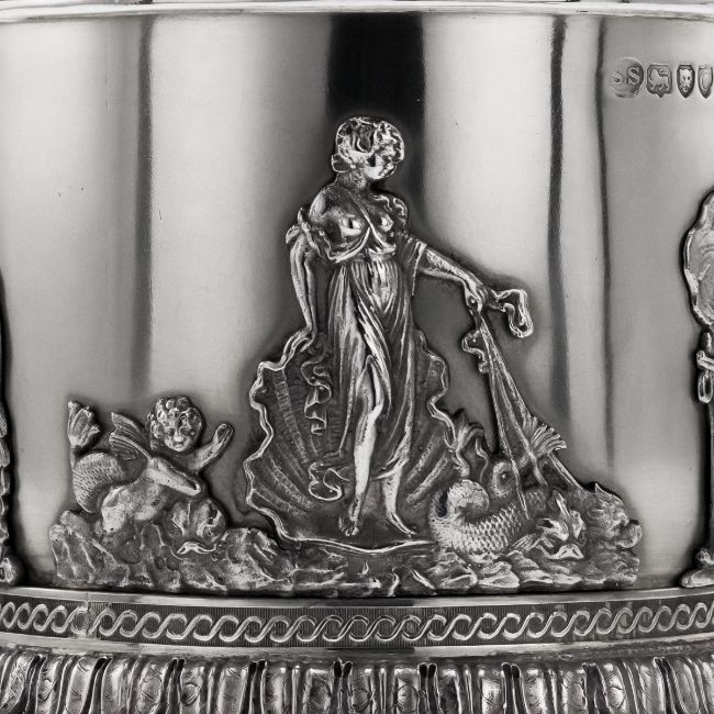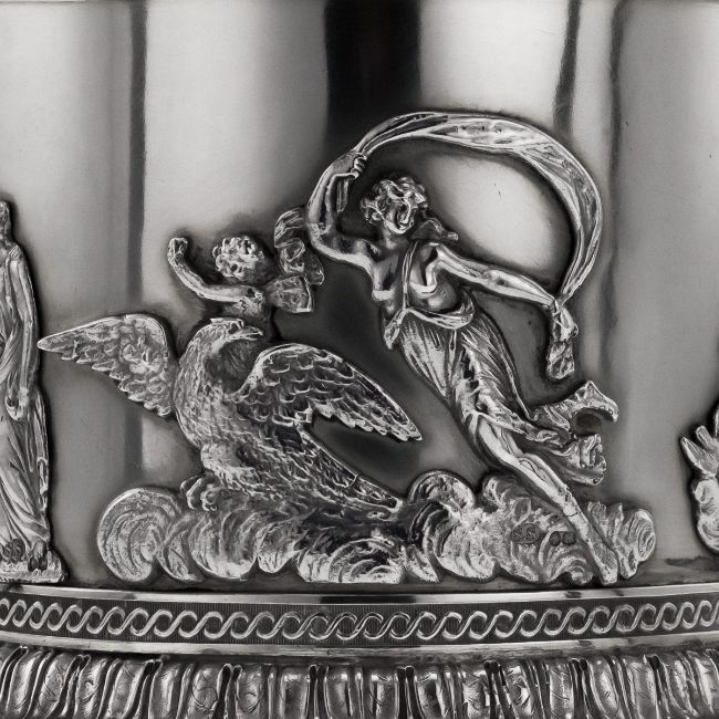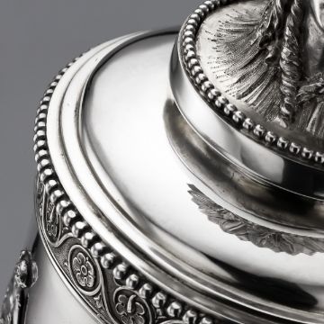 AN EXCEPTIONAL STERLING SILVER 19TH CENTURY CENTREPIECE GARNITURE, STEPHEN SMITH C. 1878 Antique 19th Century rare and magnificent Victorian Solid Silver three piece table garniture, the cylindrical central piece applied with a cast Neoclassical frieze depicting mythological figures, surmounted by a triple-headed Greek goddess, the lateral pieces cast as winged sphinxes, each piece is surmounted by a circular etched glass bowl, the garniture features an exceptionally high-quality, in the highly-decorative Egyptian and Neoclassic revival styles, both inspired by the late-18th century French style, typical of the Victorian period, the modelling and the craftsmanship is unusually high and detailed. Each part is Hallmarked English silver (925 standard), London, year 1878 (C), Maker's mark S.S for Stephen Smith, important silversmith specializing in unusual and highly-decorative designs. In Great Condition - no damage.CENTRAL PIECE SIZE Total Height: 32cm Total Width: 25.5cmLATERAL PIECES SIZE Total Height (each): 16cm Total Width (each): 16 x 12.5cm Total Silver Weight: 2810g