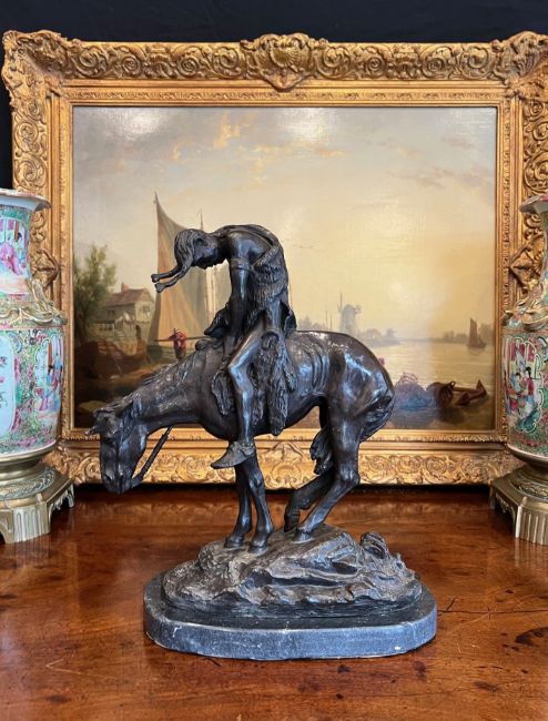 AFTER JAMES EARL FRASER: 'THE END OF THE TRAIL'the bronze figure of a native American Indian on horseback, on naturalistic base, raised on a marble plinth 35cm high overall