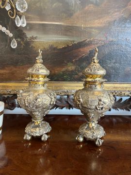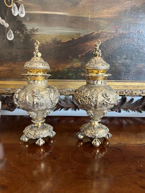A FINE PAIR OF STERLING SILVER GILT SUGAR CASTERS BY GEORGE FOX, C. 1903the antique, early 20th century Edwardian silver urns and covers surmounted by bearded men finials, the bodies with genre scenes, figures and buildings, each raised on four claw and ball feet, hallmarked London, 1903, maker's mark GF,1605 grams (51.60 oz troy) in weight overall27cm high (2)