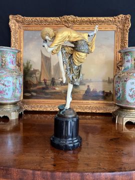 AN ART DECO STYLE COLD PAINTED BRONZE AND MARBLE FIGURE OF A DANCING GIRLafter Chiparus, a snake at her feet, in gold robes, bearing signature 'D.H. Chiparus', on a black marble plinth,44cm high