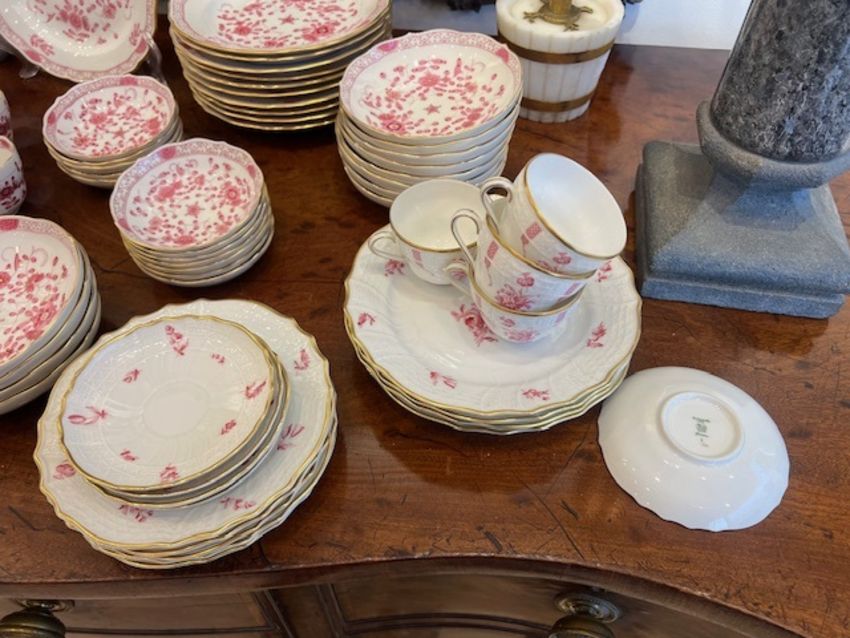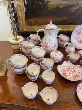 MEISSEN: AN EXTENSIVE 'INDIAN PINK' PORCELAIN COFFEE AND DESSERT SERVICEthe set decorated with a central flower head within scrolling flowers, with triangular borders and gilt highlights, variously marked with blue crossed swords mask and pink painted numbers such as 343401276, comprising a coffee pot, sugar bowl and lid, cream jug, two shallow dishes with scalloped edges, a small shaped dish, ten tea cups, twelve saucers, twelve coffee cups, twelve coffee cup saucers, and ten cake plates, also including a further part tea set of similar pink design on a white ground, marked 'Hutschenreuther Germany Dresden', comprising nine small plates, four coffee cups and saucers,QtyCondition: We have not carefully examined every piece of this extensive set but there is no immediiately noticeable damage and the set appears to be in overall good condition.