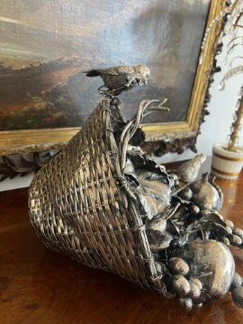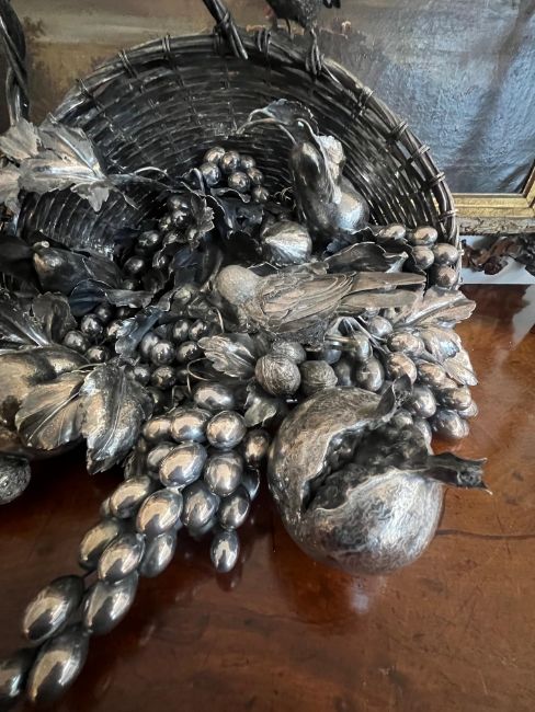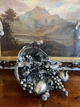 A MASSIVE STERLING SILVER ITALIAN FRUIT BASKET CENTREPIECE ATTRIBUTED TO BUCCELLATIthe table centrepiece modelled as a basket of fruit containing grapes, strawberries, apples,a pear and a pomegranate, with two birds resting on the fruit, marked to inside and on birds '925' in an oval circle, also marked 'STERLING',4576 grams (147.1 oz troy) in weight46cm x 35cmPROVENANCE:Christie's, New York, 21 October 2011, lot 56, sold $22,500. With old lot label to underside.