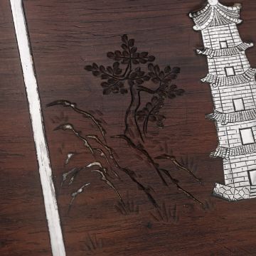 AN EARLY 20TH CENTURY CHINESE SOLID SILVER LARGE TEA TRAY, LUEN HING c.1900 Antique early-20th Century Chinese export solid silver impressively large tea tray, bamboo shaped handles and corner plaques chased with matted ground. Mounted on a large rosewood serving tray, of rectangular form, the surface is inlaid with silver depicting a river with river boats and a pagoda, the top left with 4 Chinese characters. Hallmarked with Chinese export silver marks 90 (900+ standard purity), Retailer WK (unknown) Width: 65cm Height: 37cm Depth: 3cm