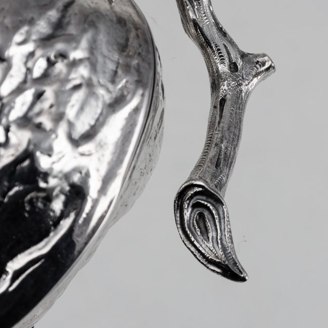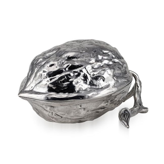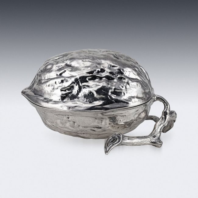 A 19TH CENTURY STERLING SILVER NOVELTY WALNUT SHAPED SUGAR BOX, LONDON, C. 1886 Antique 19th Century Victorian solid silver sugar box, crafted in the shape of a walnut, supported by a stem stand, opens to reveal a hollow interior cavity designed to possibly hold sugar or other sweet conserves. Hallmarked English silver (925 Standard), London, year 1886 (L), Makers mark WL (William Leuchars).In Great Condition - Wear expected with age. Height: 7 cm // 2.76 in Width: 13 cm // 5.12 in Depth: 10 cm // 3.94 in Weight: 193 g // 6.81 oz