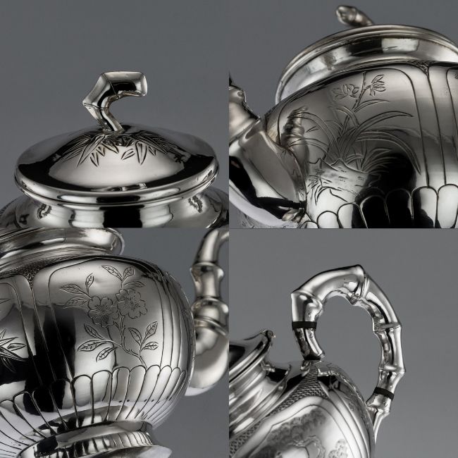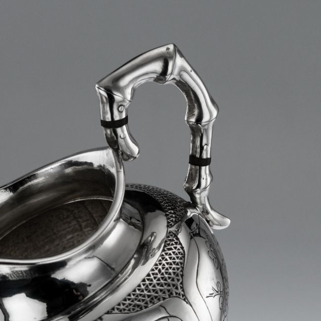 AN EARLY 20TH CENTURY CHINESE SILVER TEA SET ON TRAY, C. 1910 20th Century Chinese silver tea service on tray, comprising of a teapot, covered sugar bowl, milk jug and tray, each body is hand engraved with exotic birds within stylised cartooches, the hollow handles and spout modelled as bamboo branches. Presented on a solid silver serving tray, of complimentary design.In Excellent Condition - No Damage. TEAPOT Height: 17cm Width: 23 x 13cm Weight: 410gSUGAR BOWL Height: 12cm Width: 16 x 10cm Weight: 250gCREAM JUG Height: 10cm Width: 12 x 9cm Weight: 170gTRAY Length: 37cm Width: 28cm Weight: 947g