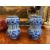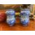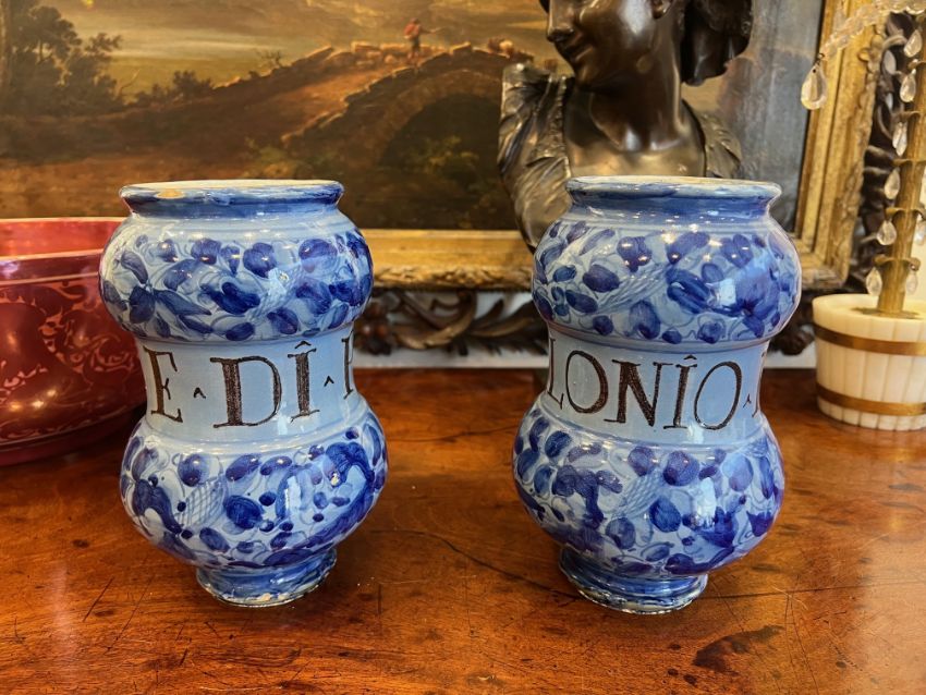 A PAIR OF ITALIAN MAIOLICA DRUG JARS17th / 18th century, the pottery apothecary vases or arbarello of waistedl shape with light and dark blue glaze and a band of inscription to the bodies, 20cm high I2)