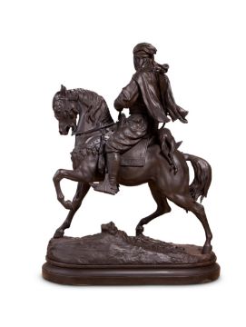 EMILE GUILLEMIN (FRENCH, 1841-1907): 'CAVALIER ARABE', CAST BY BARYE ET FILSlate 19th / early 20th century antique, the large bronzed spelter orientalist figure depicing an Arab man riding a horse, on a naturalistic oval base, signed 'E. Guillemin' and 'Barye Fils', dark brown patination,80cm high overallEmile Coriolan Hippolyte Guillemin specialised in Oriental bronzes of this type, and is one of the most renowned sculptors of late 19th century Paris. He was inspired by the Middle East to produce various Romantic figures such as Ottoman maidens and Arab hunters, and regularly exhibited at the Paris Salon from 1870. A bronze cast of this model was sold at Sotheby's, New York, 28 November 2006, lot 122, $9000. Related Literature: P. Kjellberg, 'Les Bronzes du XIXe Siecle', Paris, 1987, p. 369.