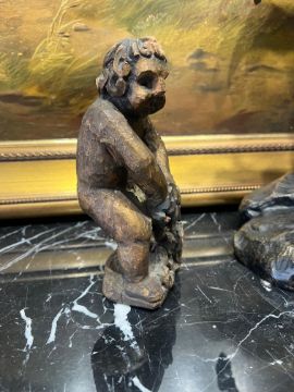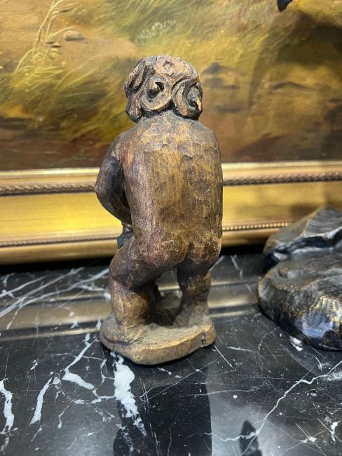 AN 18TH / 19TH CENTURY GILTWOOD FIGURE OF A PUTTOthe standing figure carved in soft wood and later gilded, probably a finial or mount from a piece of furniture,17cm high